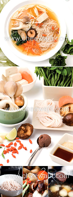 ส่วนผสม * เส้นหมี่ข้าวกล้อง 1 ห่อ * เห็ดนางฟ้าผ่าครึ่ง 2 ขีด * เห็ดฟาง 2 ขีด * แครอทซอย 1 หัว * ถั่วงอกดิบ 1 กิโลกรัม * ใบบัวบก 8-9 ใบ * ผักหวาน 2 ขีด * กะปิเผา 1/4 ถ้วย(บีบมะนาวเล็กน้อยเพื่อให้ละลายได้ง่าย) * พริกขี้หนูซอย 20 เม็ด * กระเทียมซอย 5 กลีบ * มะนาวหั่นเป็นชิ้น 4 ลูก * น้ำซุป วิธีทำ 1. ลวกเส้นหมี่ในน้ำเดือด ตักขึ้นแช่ในน้ำเย็น ตักใส่จานพักไว้ 2. ลวกแครอท ผักหวาน เห็ดนางฟ้า เห็ดฟาง (ทีละชนิด) ในน้ำเดือด ตักขึ้นแช่ในน้ำเย็น ตักใส่จานพักไว้ 3. จัดเส้นหมี่ แครอท ผักหวาน เห็ดนางฟ้าและเห็ดฟางที่ลวกไว้ใส่ชามตามต้องการ เทน้ำซุปผัก เสิร์ฟพร้อมเครื่องเคียง ใบบัวบก ถั่วงอกดิบ กะปิ พริกขี้หนู กระเทียม และมะนาว(ถ้าไม่ชอบกะปิก็ไม่ต้องใส่ลงไป) ส่วนผสมน้ำซุป * แครอทหั่นแว่น 1 หัว * หัวไชเท้าหั่นแว่น 1 หัว * หอมหัวใหญ่หั่นเต๋า 1 หัว * เห็ดหอมแห้งแช่น้ำ 5-10 ดอก * เก๊ากี้ 3 ช้อนโต๊ะ * เต้าหู้ 1 แผ่น * สามเกลอ 1 ถ้วย(รากผักชี กระเทียม พริกไทย โขลกรวมกัน) * น้ำตาลทรายไม่ขัดขาว 2 ช้อนโต๊ะ * ซีอิ๊วขาว 1/4 ถ้วย * น้ำเปล่า 10 ถ้วย * น้ำมันพืชเล็กน้อย วิธีทำ 1. ผัดสามเกลอจนหอม ใส่เก๊ากี้ หัวไชเท้า แครอท หอมหัวใหญ่ เห็ดหอม เต้าหู้ จนหอม 2. ใส่น้ำเปล่า ปรุงรสด้วยน้ำตาลทรายไม่ขัดขาว ซีอิ้วขาว ต้มจนสุก Tips : จะใส่เห็ดชนิดไหนก็ได้แล้วแต่ความชอบ เห็ดย่างราดตะไคร้ยำ