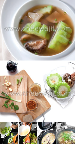 ส่วนผสม * มะระคว้านไส้ออกหั่นเป็นชิ้นสี่เหลี่ยม 1/2 ลูก * เห็ดหอม 6 ดอก * ผักกาดดอง 2 กระป๋อง * สามเกลือ (รากผักชี พริกไทย กระเทียม โขลกรวมกัน) 2 ช้อนโต๊ะ * น้ำมันมะกอก 2 ช้อนโต๊ะ * เต้าเจี้ยว 2 ช้อนโต๊ะ * น้ำเดือด 6 ถ้วย * ซีอิ๊วขาว 2 ช้อนโต๊ะ * พริกไทย 2 ช้อนชา * น้ำผักกาดดอง 1/4 ถ้วย * น้ำแช่เห็ดหอม 1/4 ถ้วย * ต้นหอมผักชีซอย(สำหรับโรยหน้า) วิธีทำ 1. ผัดน้ำมันมะกอกกับ 3 เกลอ จนหอม ใส่เต้าเจี้ยวผัดพอเข้ากัน ใส่มะระหั่นไว้ แล้วใส่น้ำแช่เห็ดลงไปเล็กน้อย ผัดให้เข้ากัน ใส่เห็ดหอม ผักกาดดองลงไปผัดให้เข้ากัน 2. ใส่น้ำเดือดและน้ำผักกาดดอง เคี่ยวจนมะระเปื่อย ปรุงรสด้วย พริกไทย ซีอิ๊วขาว 3. ก่อนเสิร์ฟ โรยต้นหอม ผักชีลงไป Tips * ควรเลือกมะระจีนที่มีผิวสีเขียวอ่อน มีร่องไม่ลึกมาก จึงจะได้มะระอ่อนที่มีรสชาติไม่ขม * ควรปรุงรสหลังจากใส่น้ำผักกาดดองลงไป เพราะจะทำให้ปรุงรสชาติได้อร่อยกลมกล่อม ไม่เค็มจนเกินไป