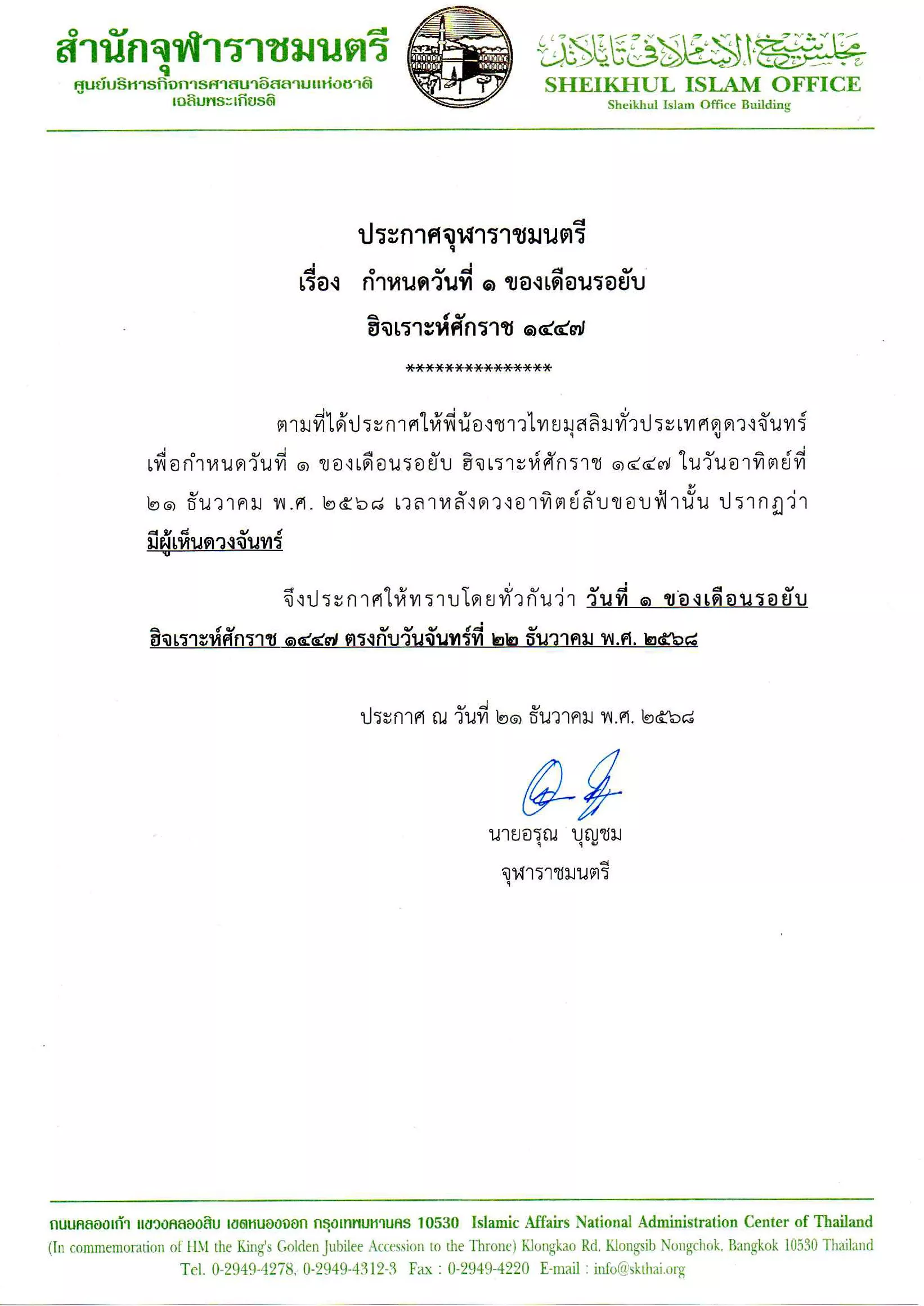 จึงประกาศให้ทราบโดยทั่วกันว่า วันที่ 1 ของเดือนรอยับ ฮิจเราะห์ศักราช 1447 ตรงกับวันจันทร์ที่ 22 ธันวาคม พ.ศ. 2568